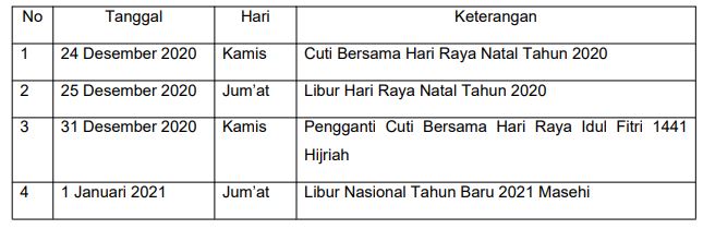 Hari Libur dan Cuti Bersama Hari Raya Natal 2020 serta tahun baru 2021 sebagai berikut :